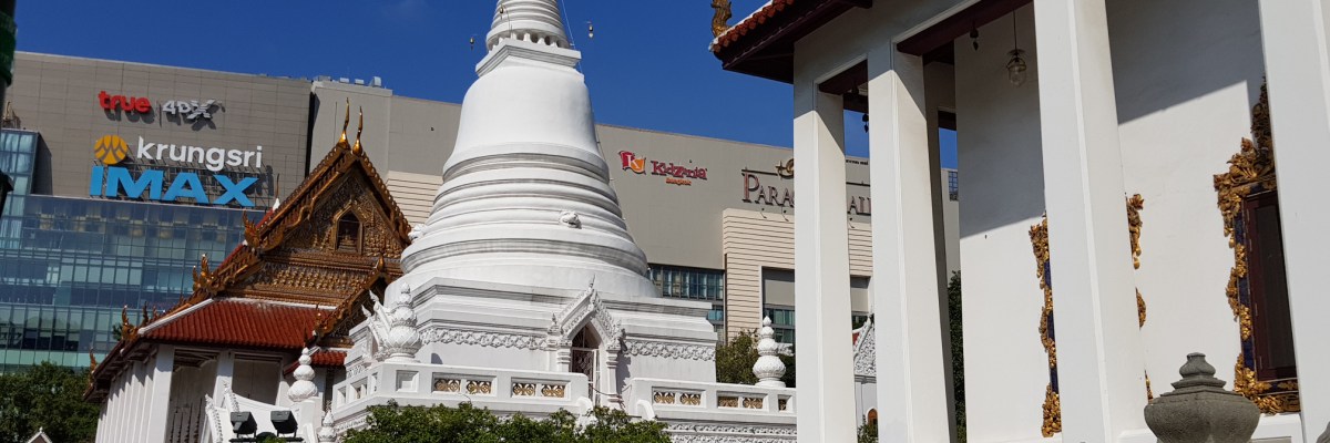 Wat Pathum Wanaram is just between the two shopping malls Siam Paragon and CentralWorld, and across the street of Siam Square.