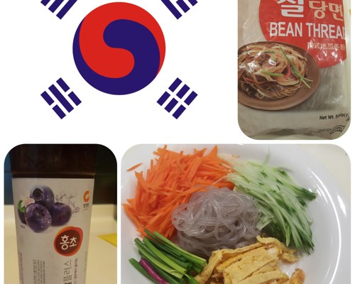 To serve, arrange noodle, cucumber, carrot, egg and spring onion in a plate.