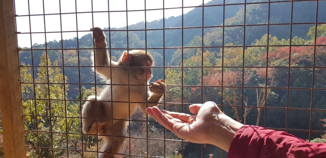 You can only feed them in the safety of a hut where you need to purchase a small bag of Apple or peanut from the vendor at 300 yen.