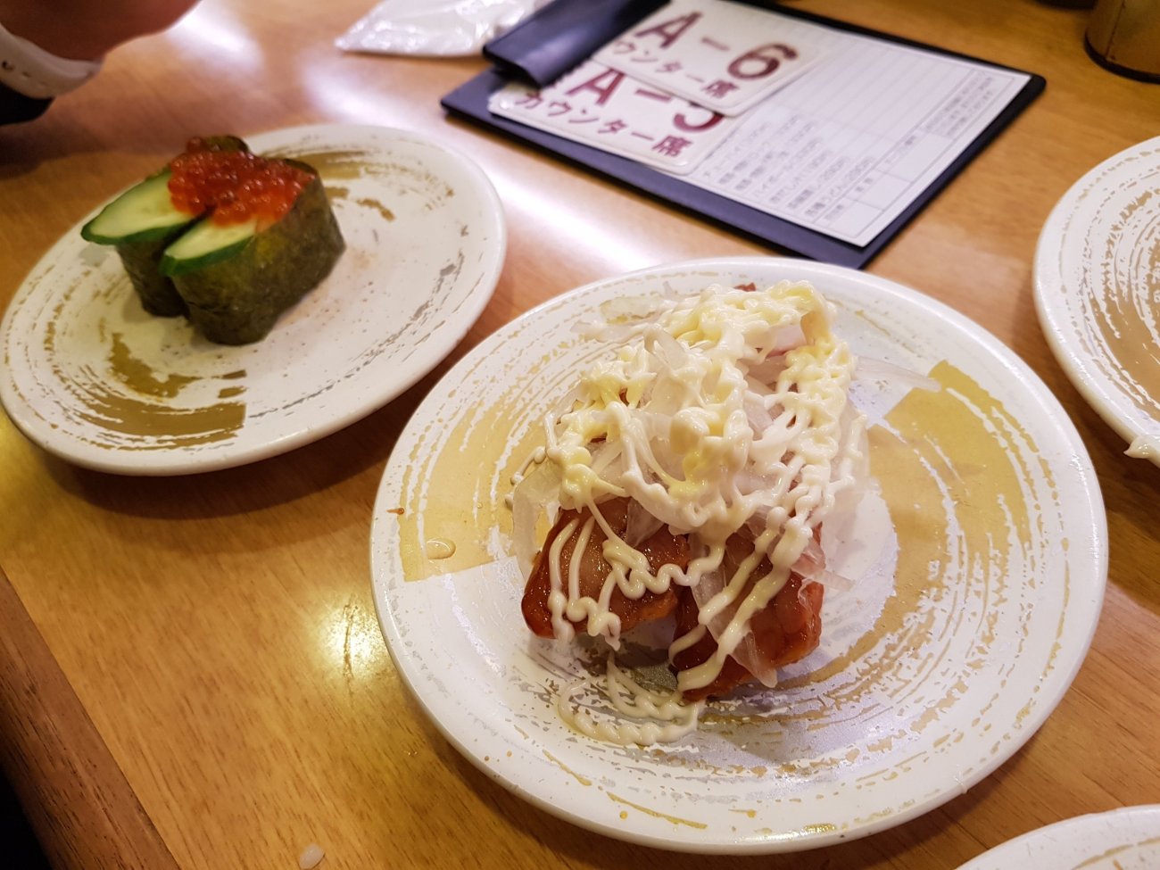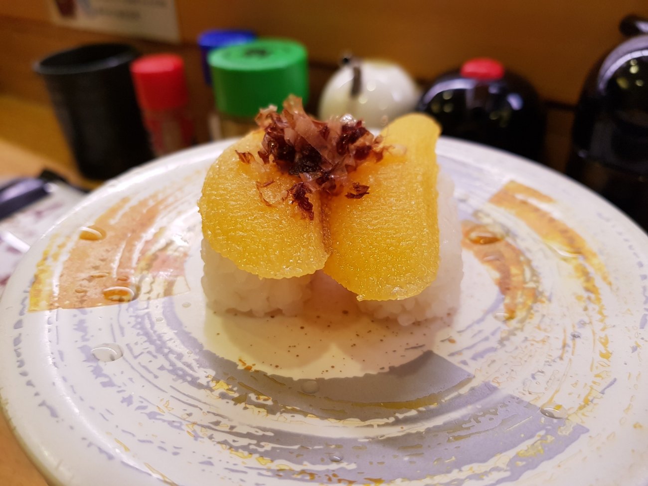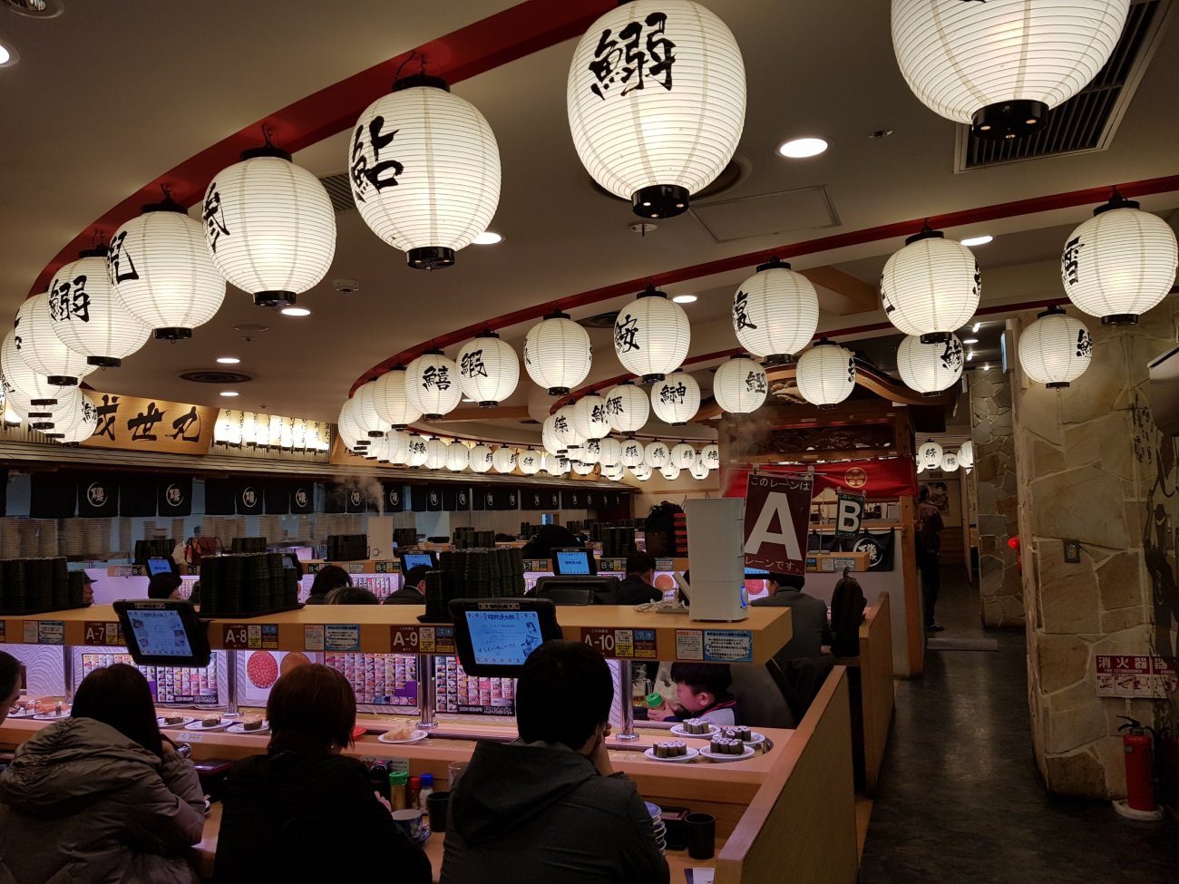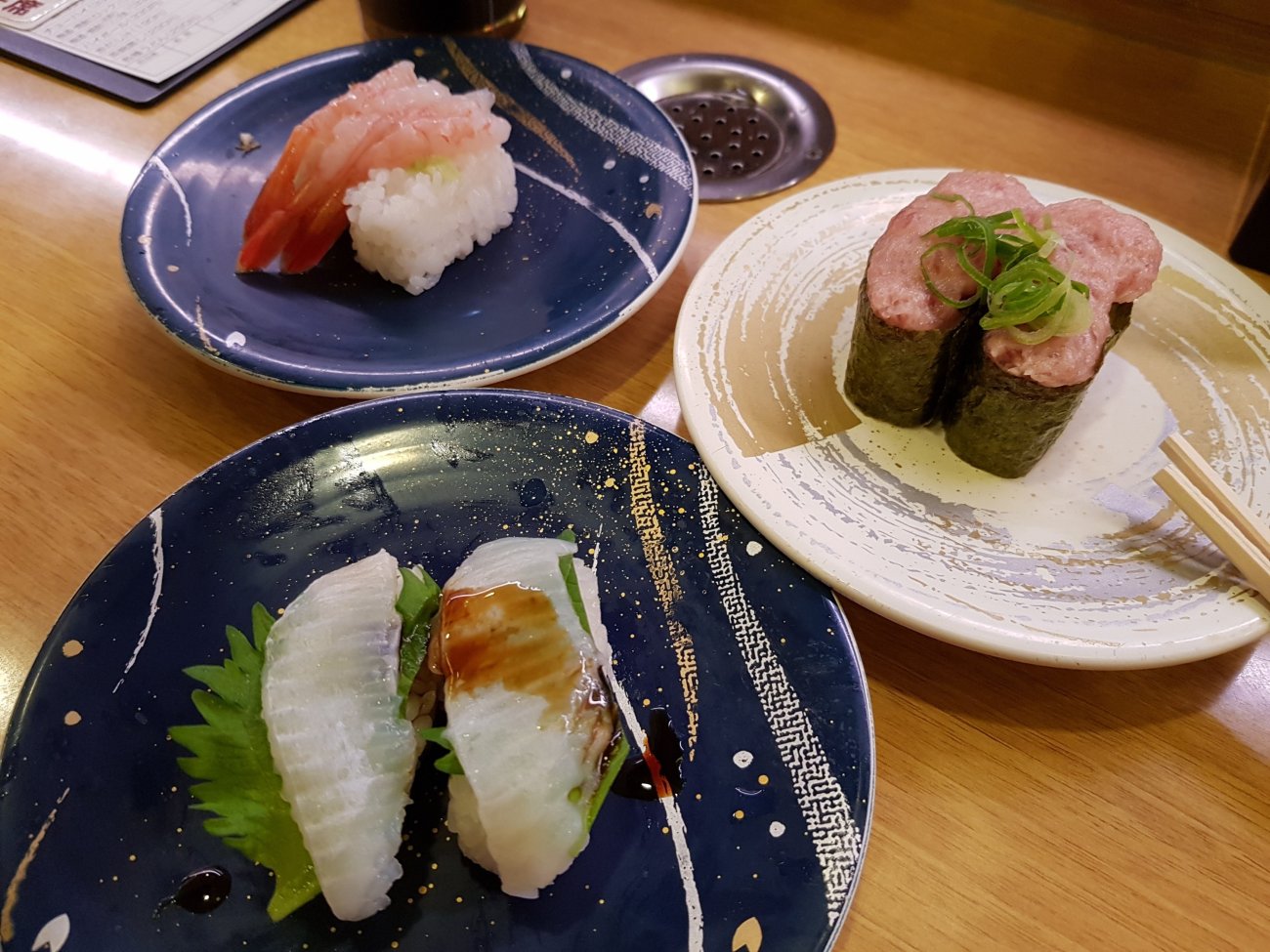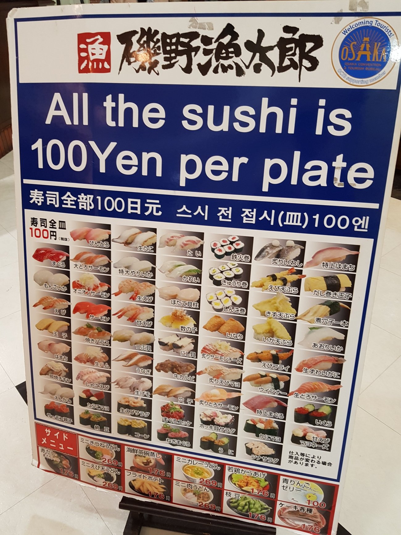 Sushi dinner in Osaka is in a conveyor belt restaurant. Each plate at 100 yen is wickedly low price. Quality is good and variety is astounding though. A very enjoyable meal for me.