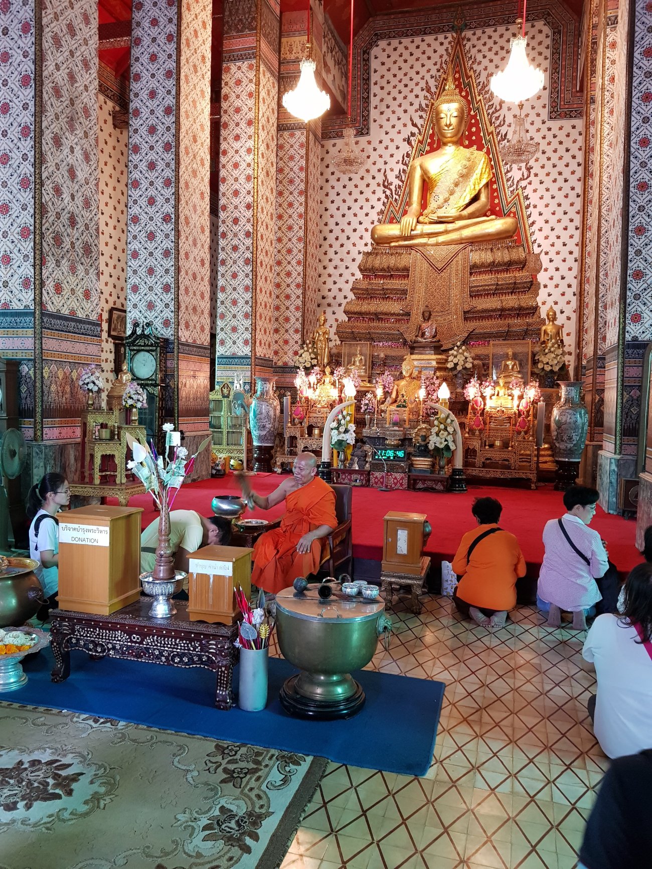 As I knelt in front of the monk, he chanted some prayer and splashed holy water over me. For that I also received a blessed bracelet from him. Guys wear it on the left wrist and the gals wear it on their right wrist. If you wish to give donation, there is a donation box beside the monk. (In Thailand, the monks are not suppose to handle money) So just drop your donation into the box. If you are female, please refrain from having any body contact with the monks. In this situation, if you wish to get the blessed bracelet, just place your open palms together, and he will drop the blessed bracelet into your hand.