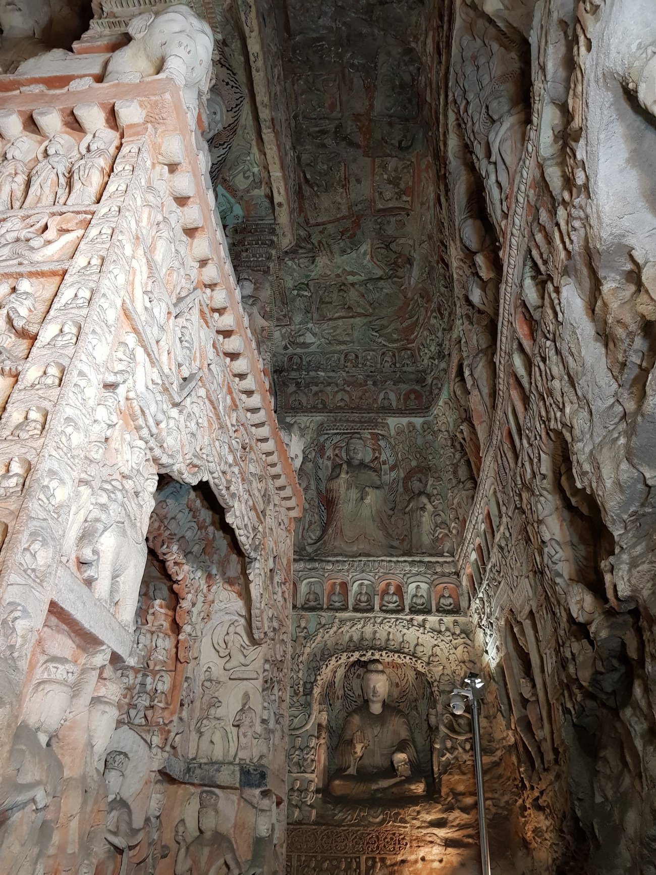 Ancient Buddhist carved beautiful sculptures into the mountain. Giant Buddha images and small images of angels and demi gods adorn the cave wall. Very awe inspiring.