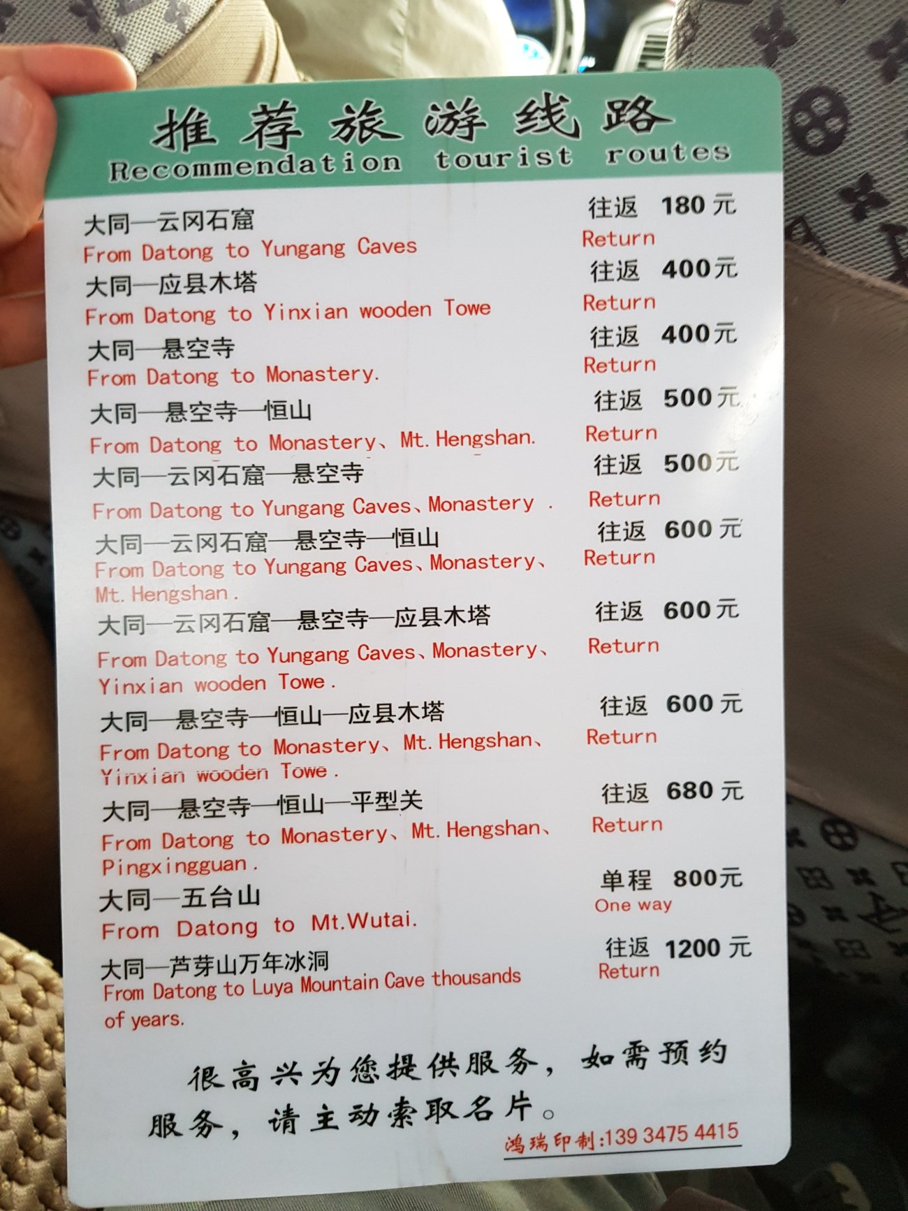 Yungang Grotto is not too far from datong city. There are public buses that can bring you to the attraction. But I would recommend hiring a cab. The trip should cost no more than rmb 80 from the city. 30 min ride, depending on traffic. I chartered a taxi and the cab driver waited at the public carpark for me. Saved me the hassle. Price list above. You can bargain a bit if you want. The prices are similar to my research on Chinese local traveller blog, so I know the rates are reasonable.