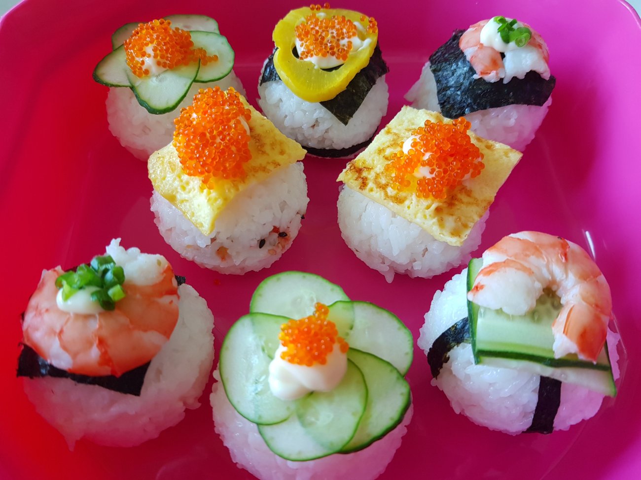 6. The Decoration is up to your imagination. I used traditional coloured pickles, egg, cucumber, mayonnaise, seafood and seaweed. But feel free to use coloured salt or sugar. Cake decoration, etc. HAVE FUN!