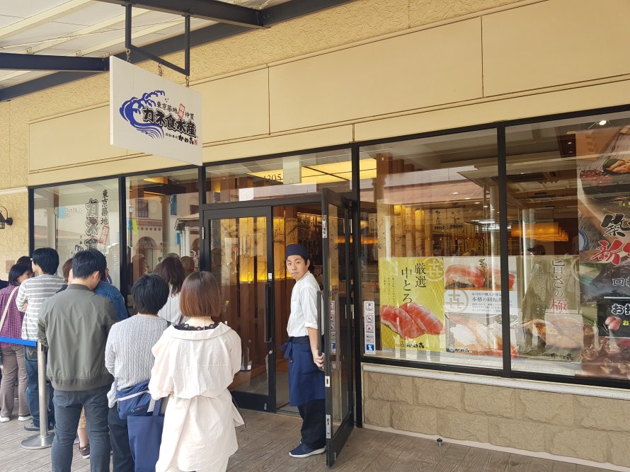 There is a conveyor belt sushi restaurant at the premium outlet. Their food and green tea is great!