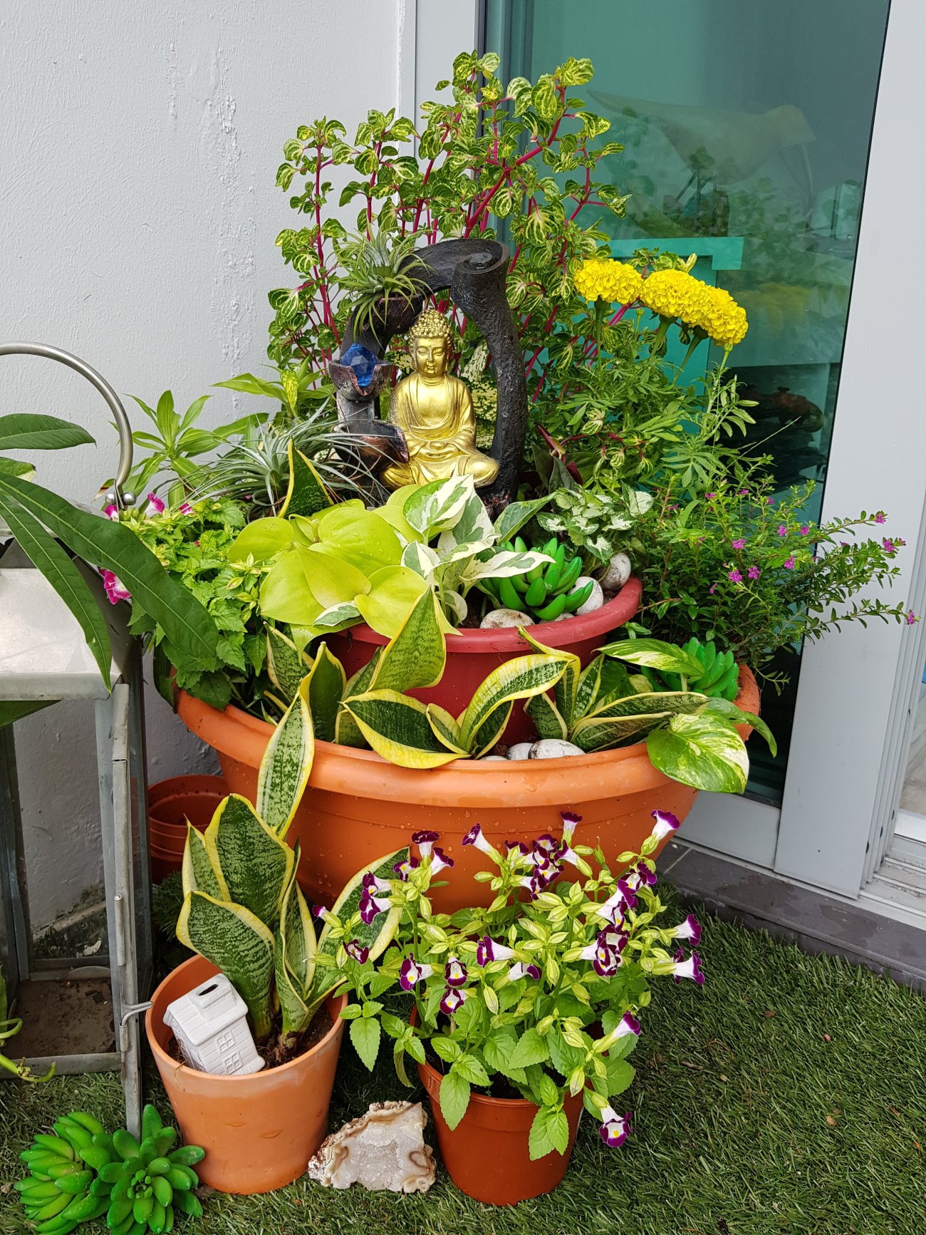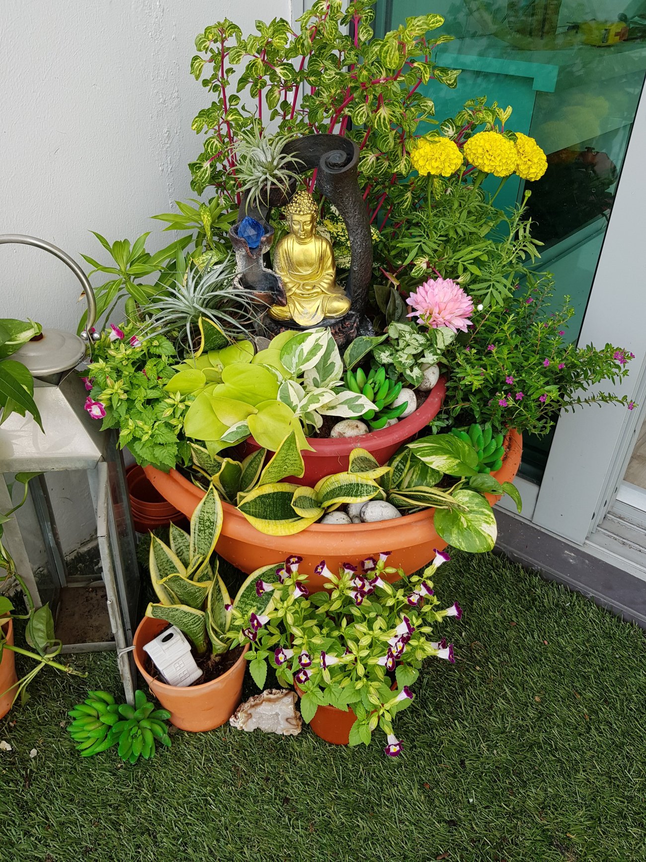 In my instance, the statue is a centre piece and the plants and flowers are like offerings. Hope this zen garden will inspire my meditation in the balcony!