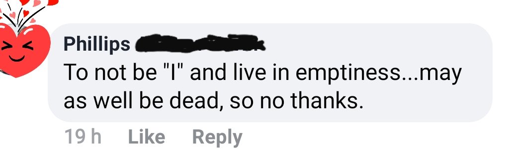 For many people, the idea of non “I” is terrifying. As can be seen from the below screen shot comments.