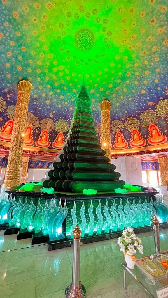 Recently, I visited Wat Paknam in Bangkok. There is a huge pagoda in this temple and inside this pagoda is a large glass pagoda (see below). The ceiling is painted with stars and the past 28 Buddhas of our current world system. The 28 Buddhas include Sakyamuni Buddha and according to Buddhist scriptures, a Buddha may reappear in a world period when the Dharma has been completely forgotten. The next Buddha-to-be shall be called Maitreya Buddha.