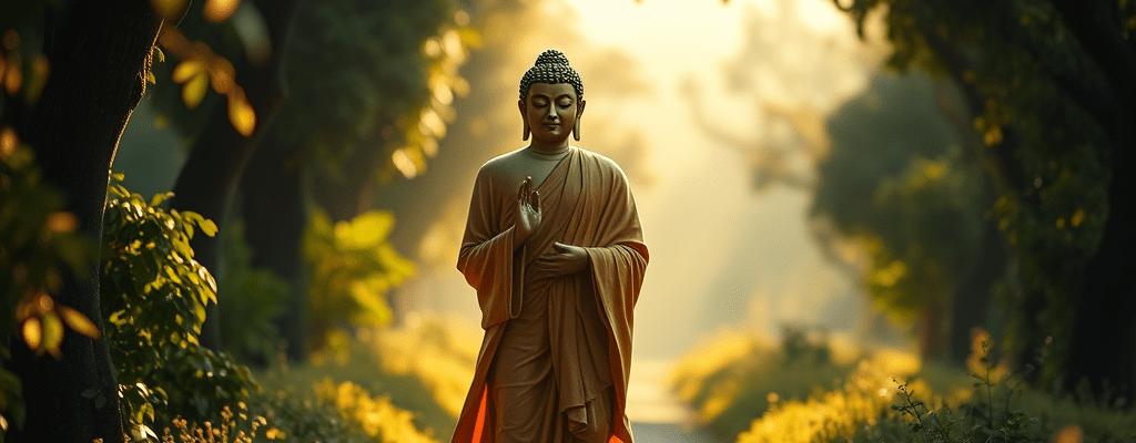 As the Buddha journeyed toward the Deer Park, he encountered the wandering ascetic Upaka, who, noticing the Buddha’s radiant appearance, approached him and asked, “Friend, your eyes, ears, nose, tongue, body, and mind are so clear; your complexion is bright and glowing. Under which teacher have you gone forth? Whose teachings do you follow?”
