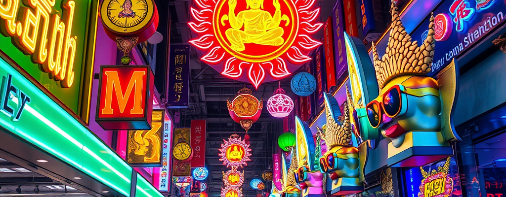 Loud colors, neon symbols, moving icons, and colorful devas wearing Sunglasses!