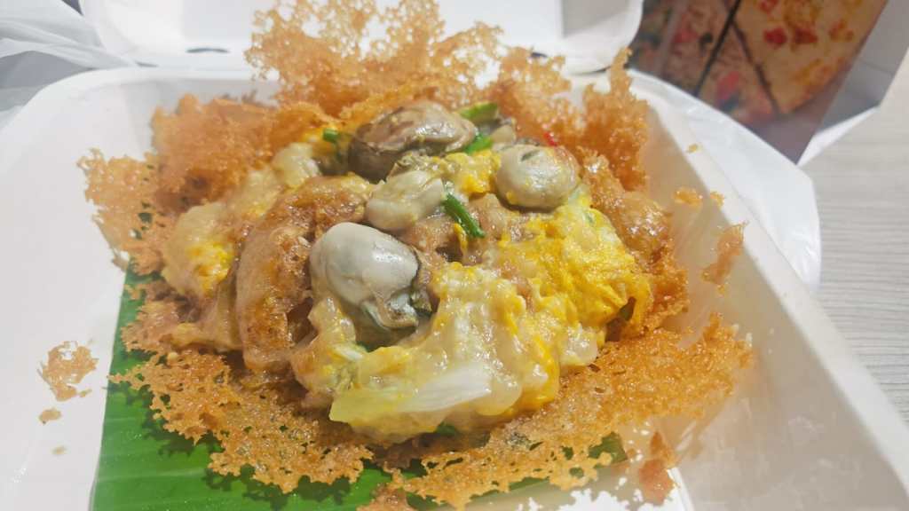 The rain intensified, and we reluctantly decided to postpone our exploration until the following evening. As we turned to leave, fate intervened—or perhaps my insatiable appetite—in the form of a stall selling fried oyster omelettes!