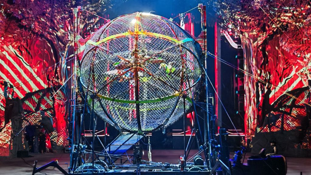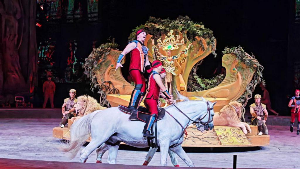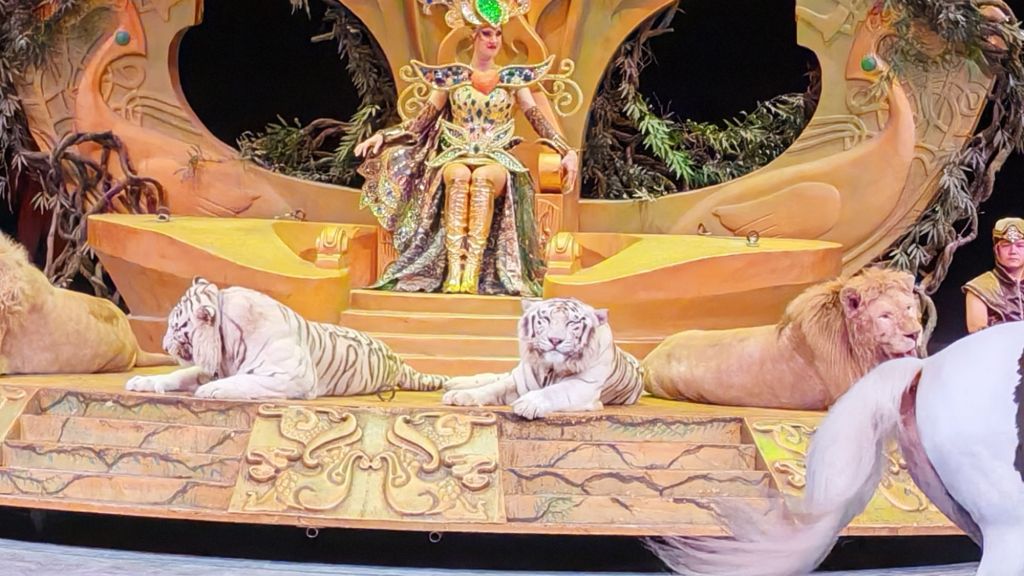 Flock of Birds flying around the circus, animals including giraffes running and prancing around the ring. White tigers. Ostrich dashing right across the aisle. Not a single moment was boring.