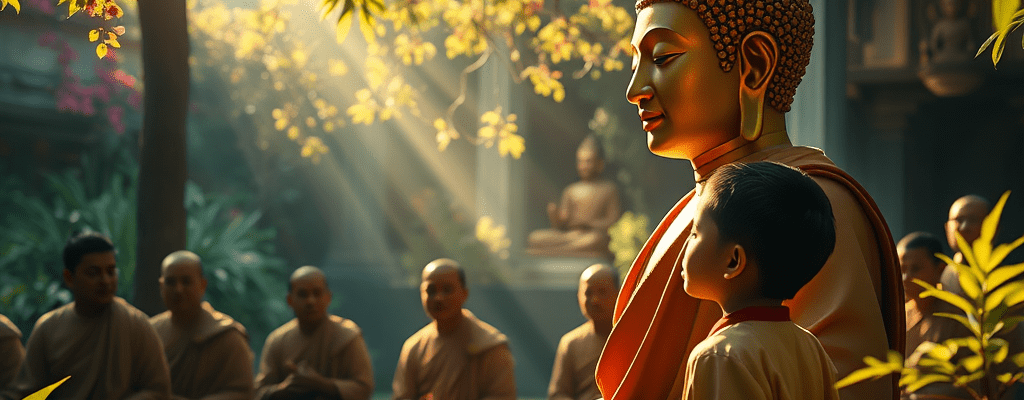 When young Rāhula approached the Buddha, he felt not royalty, but warmth — the quiet protection of a father. After the meal, as the Buddha departed for the Nigrodha Monastery, the little boy followed behind him repeating: